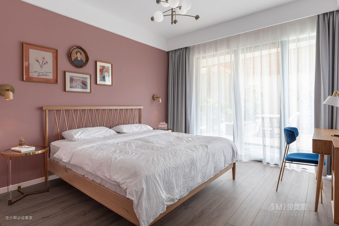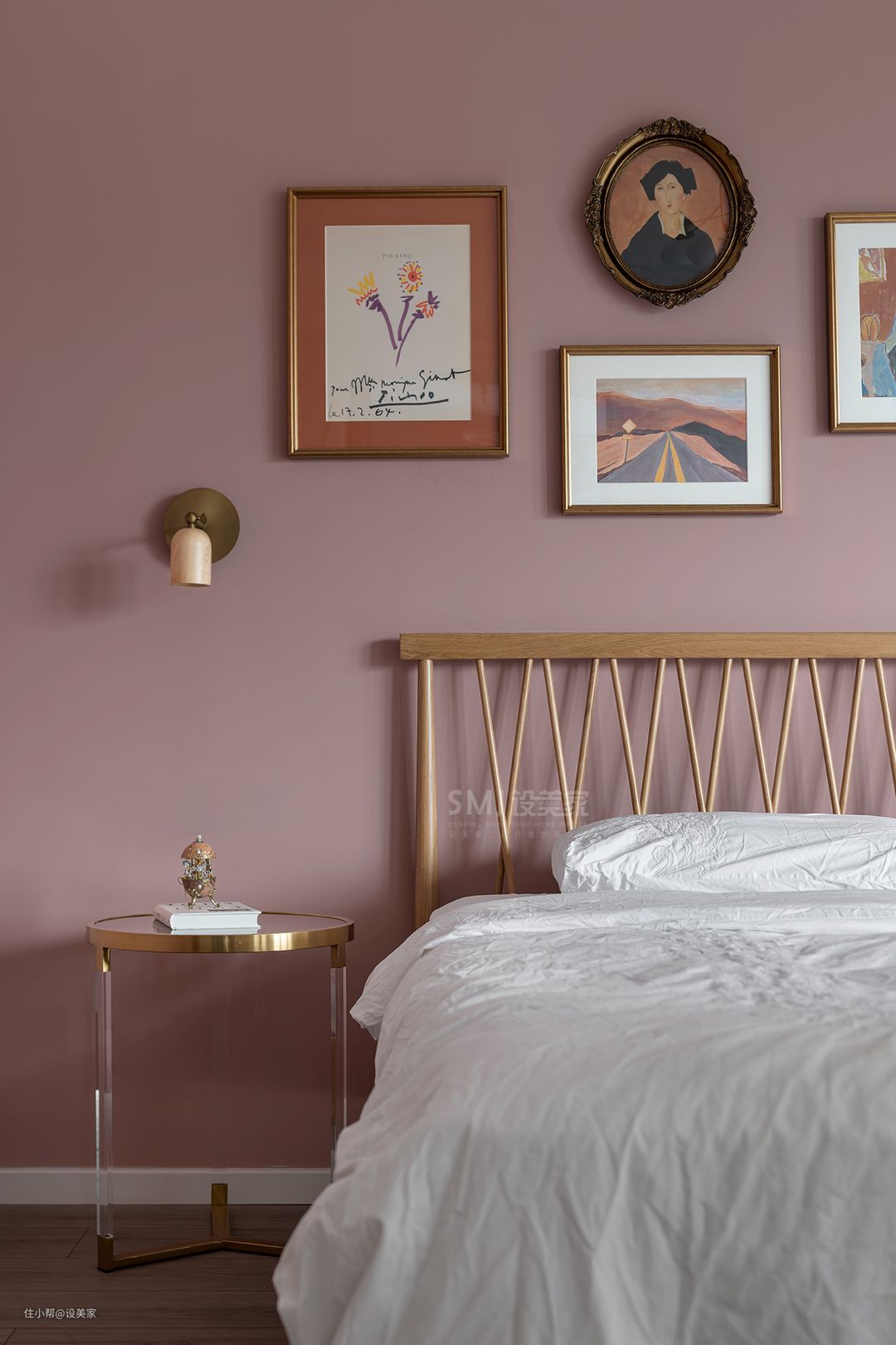 墙上的装饰画组选用金色画框装裱,一旁的床头边几、壁灯同样带了些许金色,在大面积的脏粉色映衬下显露出华丽复古的气质。