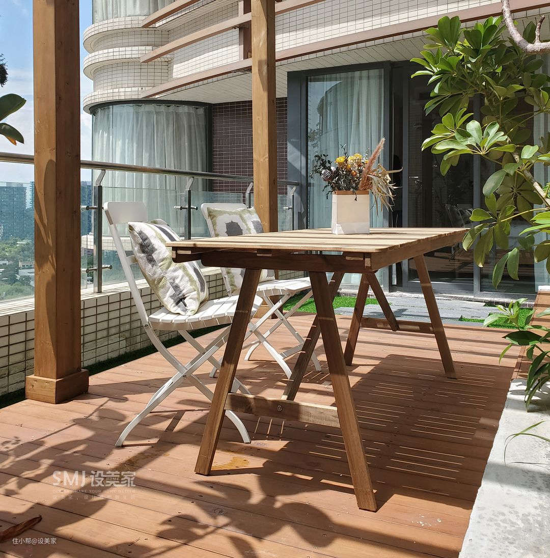 拉开门,外面是大大的露台,设计师用户外木以及绿植将这里打造成夫妻俩的专属花园。