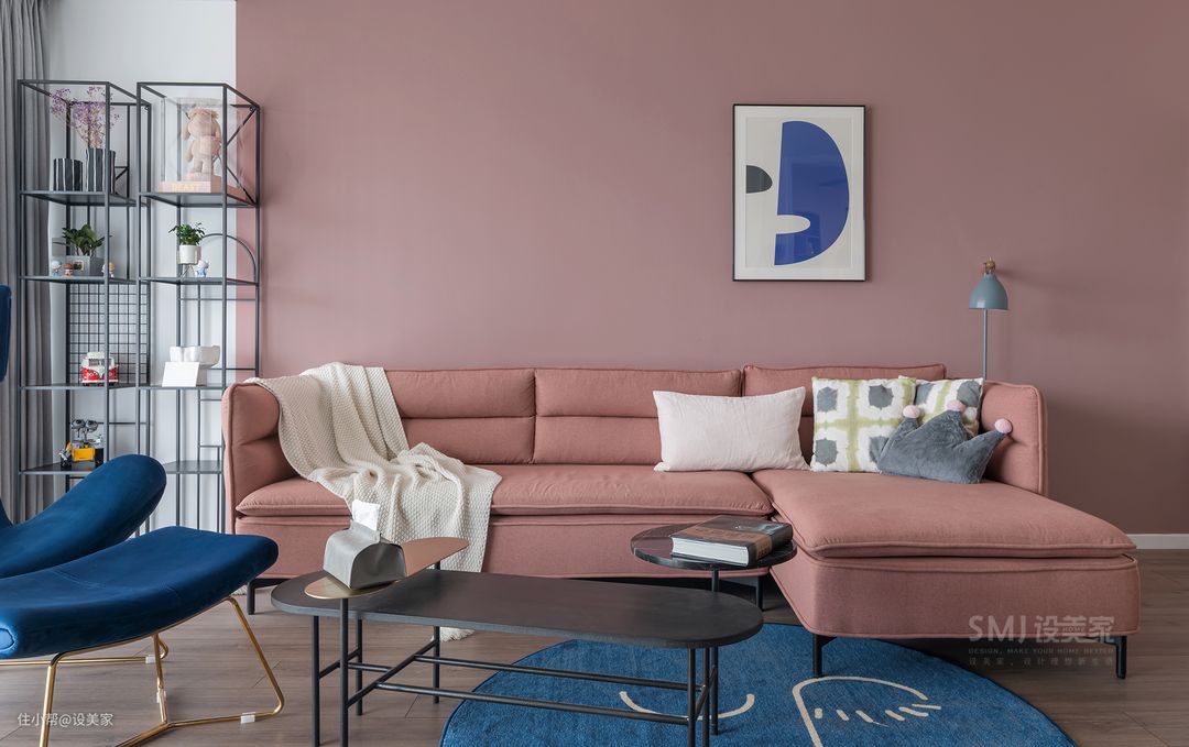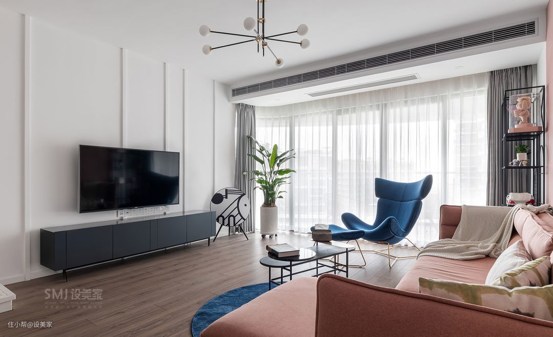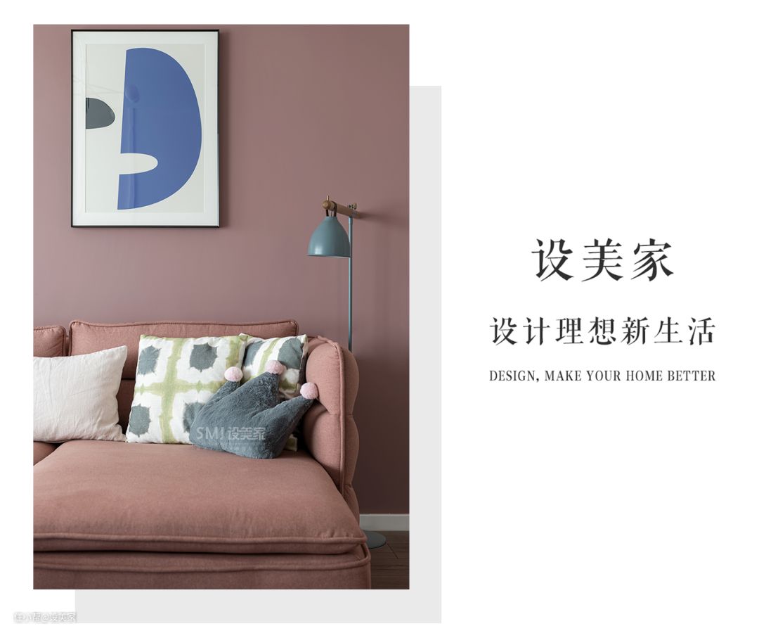沙发背景以及主家具用了业主喜爱的脏粉色,柔美不失风情,又带着复古轻奢的优雅知性,和另一边的白色电视背景墙形成对比,让整个空间不至于太过艳丽。