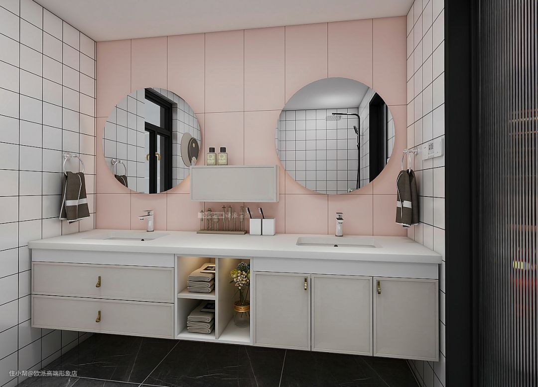▲「双台盆+双圆镜」组合,可爱时尚又不失轻奢高级感。镜子中间设计收纳小吊柜,用来放置牙膏牙刷刚刚好。台盆下采用「抽屉+开放格+平开门柜」组合,三种不同收纳方式,轻松满足浴室内大小物品的储存需求。