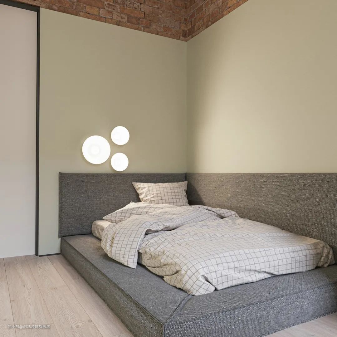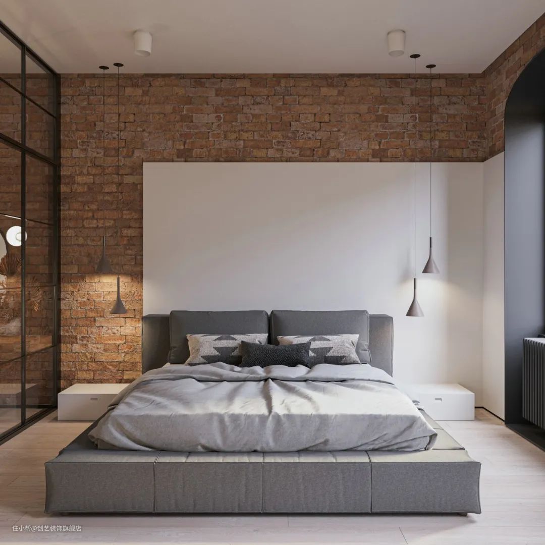 卧室主题色调为黑白灰,略显冰冷。这种氛围对色彩的包容性更高,红砖的融合让这样的工业风也可以很温馨。
