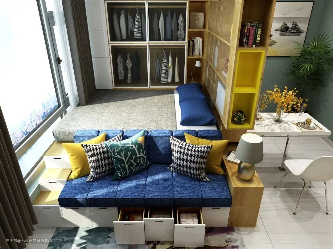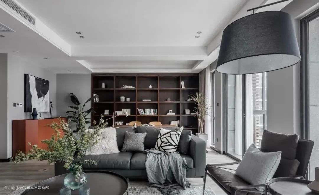如果有独立的餐厅区域,那么横厅的基础再加个办公区,在沙发后面摆上办公桌,就能获得一个大客厅与宽敞的书房。