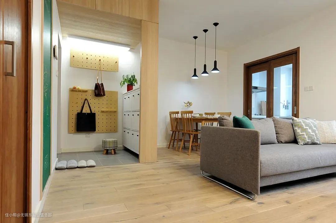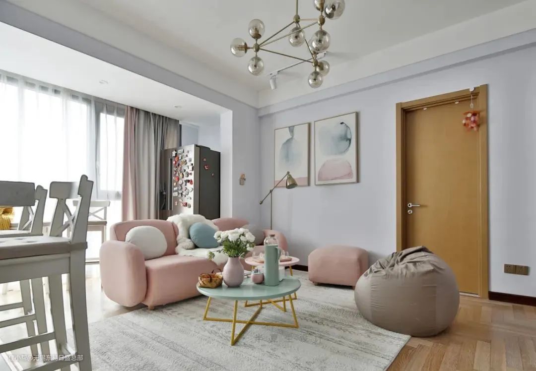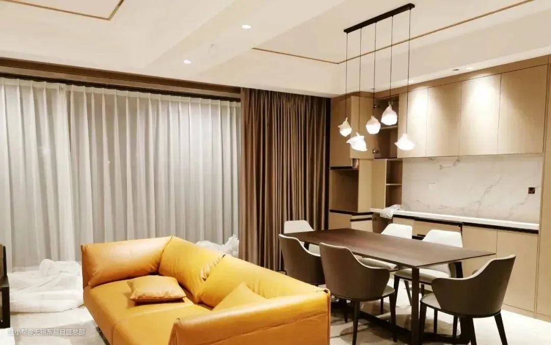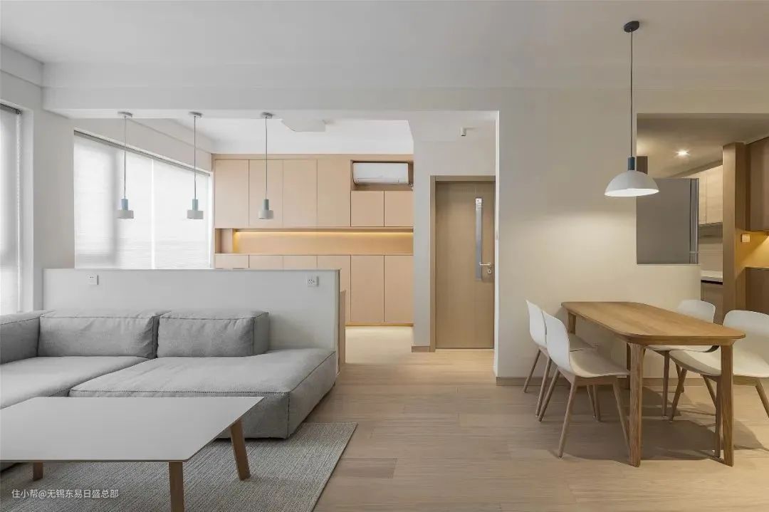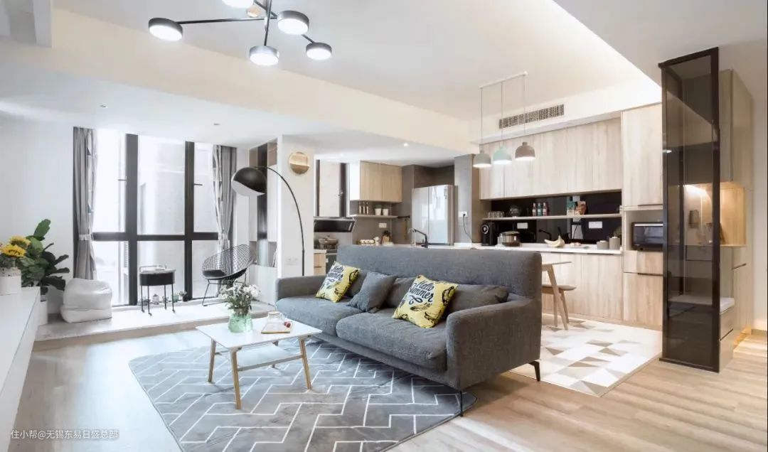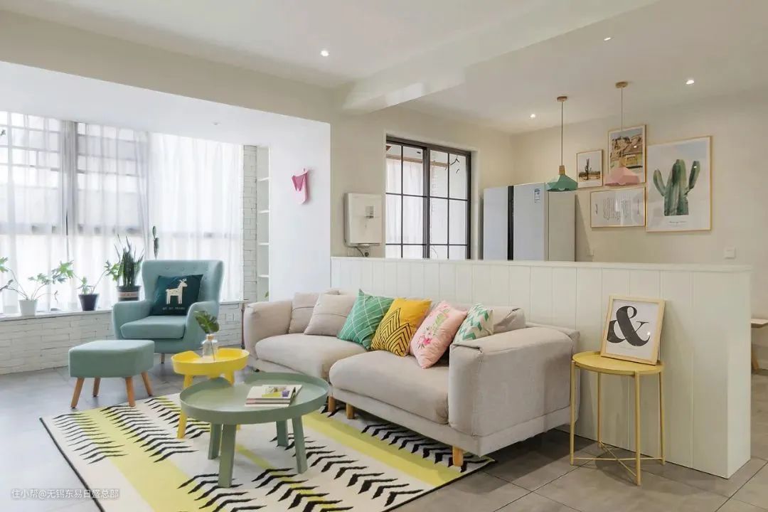 沙发不靠墙放感觉不踏实的话,可以在客餐厅中间砌个矮墙,然后沙发靠着矮墙布置,既能缓解不踏实的感受,又能保持空间的通透大方。