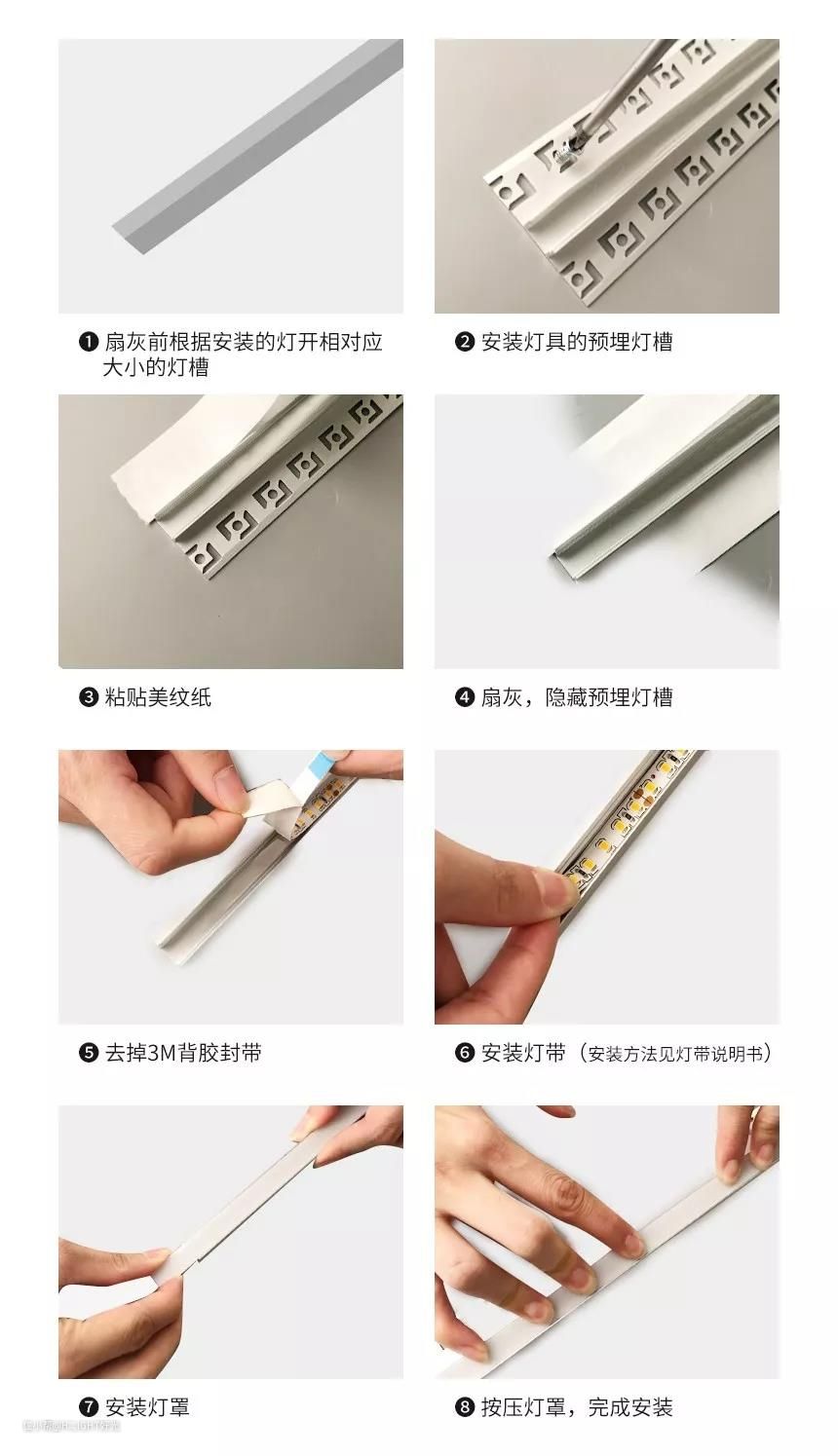 线型灯具常用的一般有灯带、灯管、硬灯条、线型灯几大类。其中根据不同灯具,传统的安装方法可划分为以下多种方式: