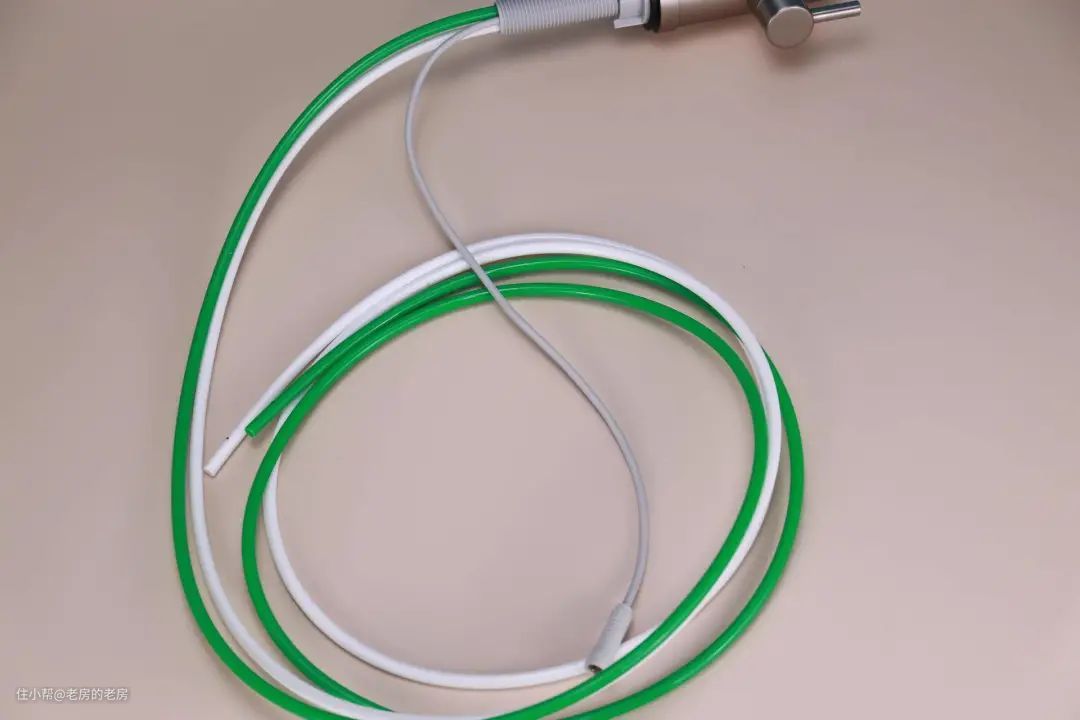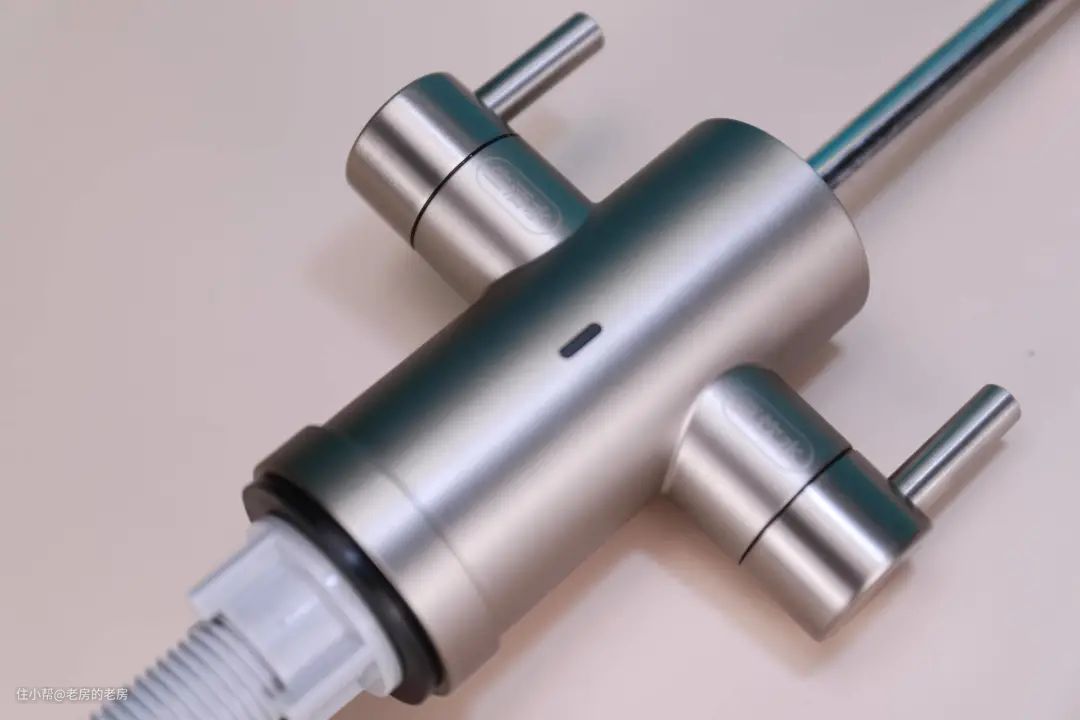 ▲接下来我们看一下包装非常规整的净水器龙头。净水器龙头本体使用不锈钢拉丝工艺。出水水管使用抛光的不锈钢内部,出水管内部有塑料管作为衬托,防止水管内部锈蚀。