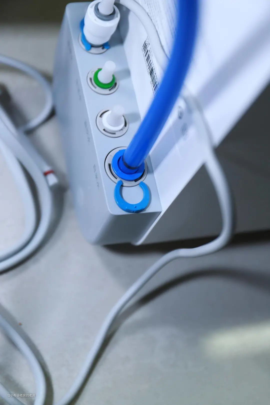 ▲然后依次连接水龙头的生活水与直饮水管至净水器后背后。而净水器浓缩水口插入配备的灰色水管,另一端与水槽废水出口相连。就这样,只要联通四根水管,一根线号线及一个电源线就可以完成安装这款厨下净水器。