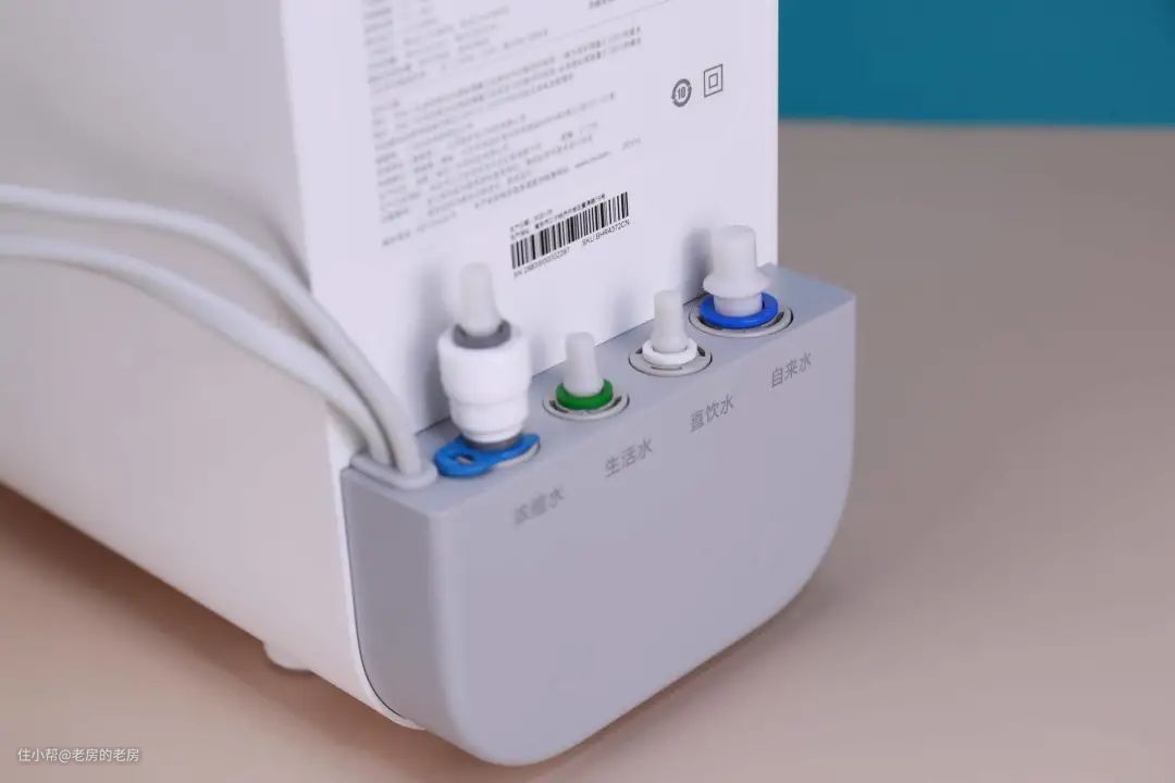 ▲净水器的反面是四个水管接口以及两条线缆。四个水管接口分别是,浓缩水,生活水,直饮水和自来水。净水器背部的两根线缆,一根是总电源线,另外一根是信号线,信号线互相连接。