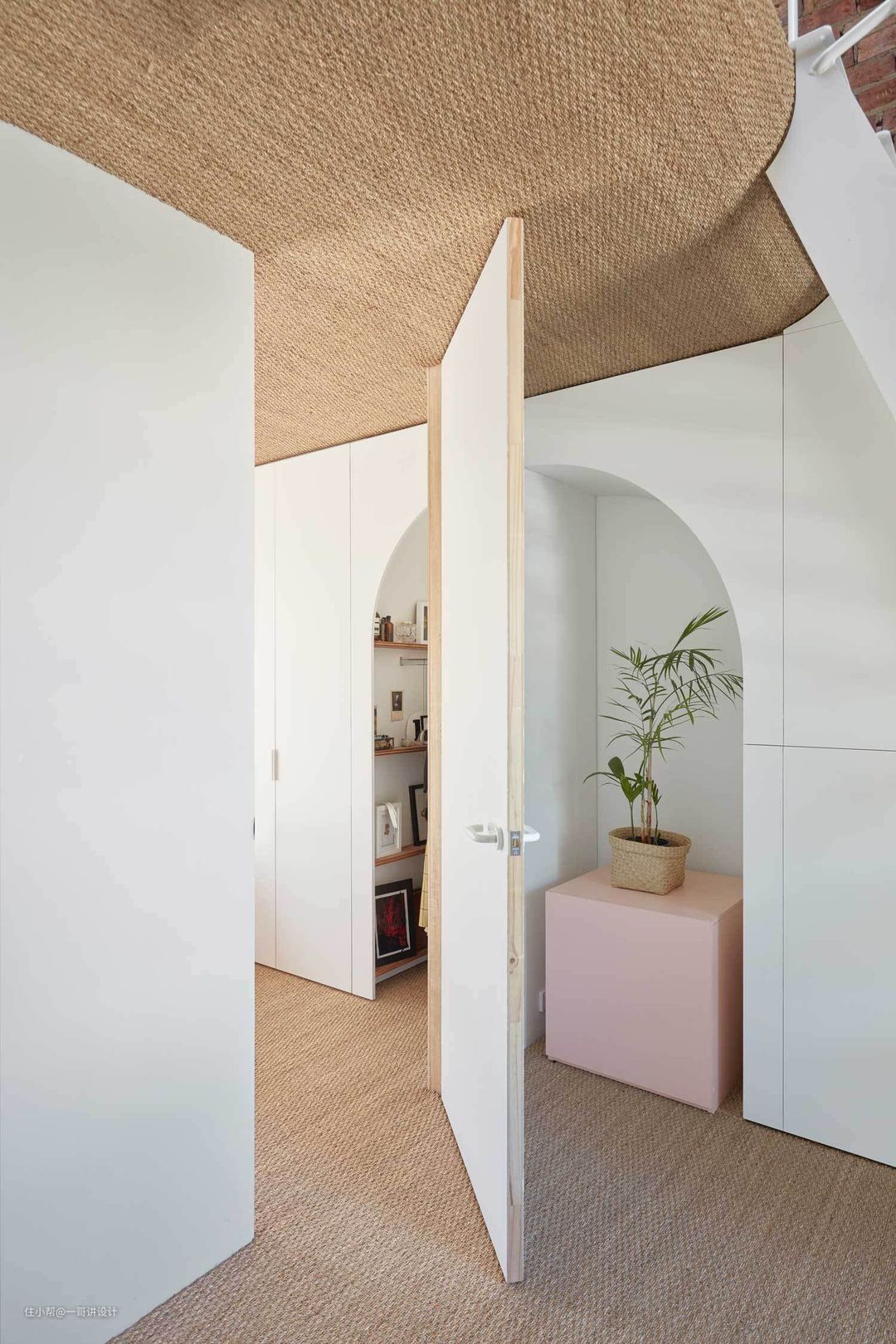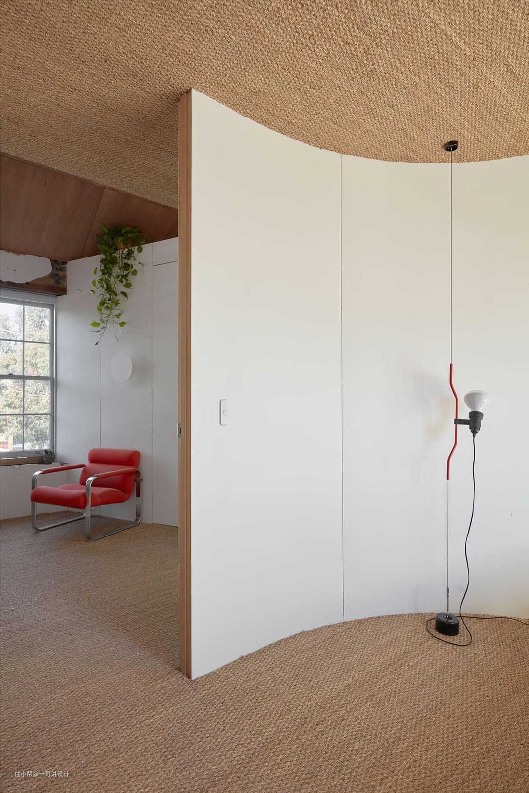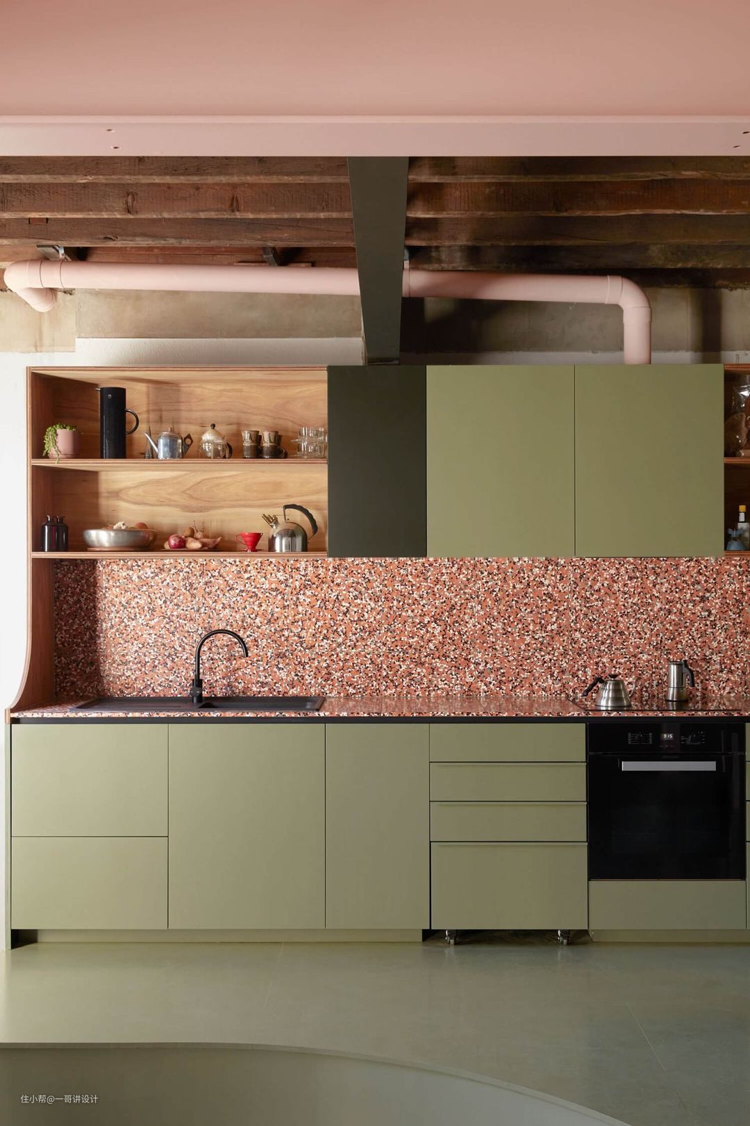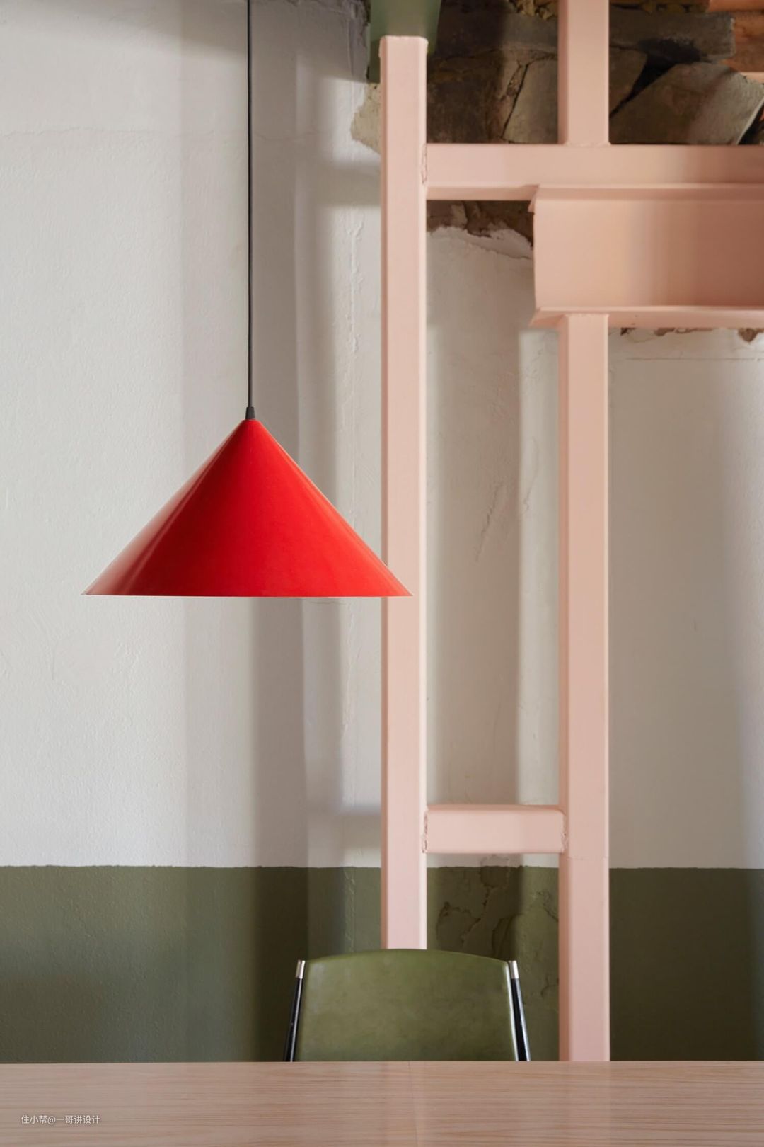 使用材料:实木,钢结构,军绿色涂料,粉色涂料,海草席,水磨石,瓷砖,水泥自流平