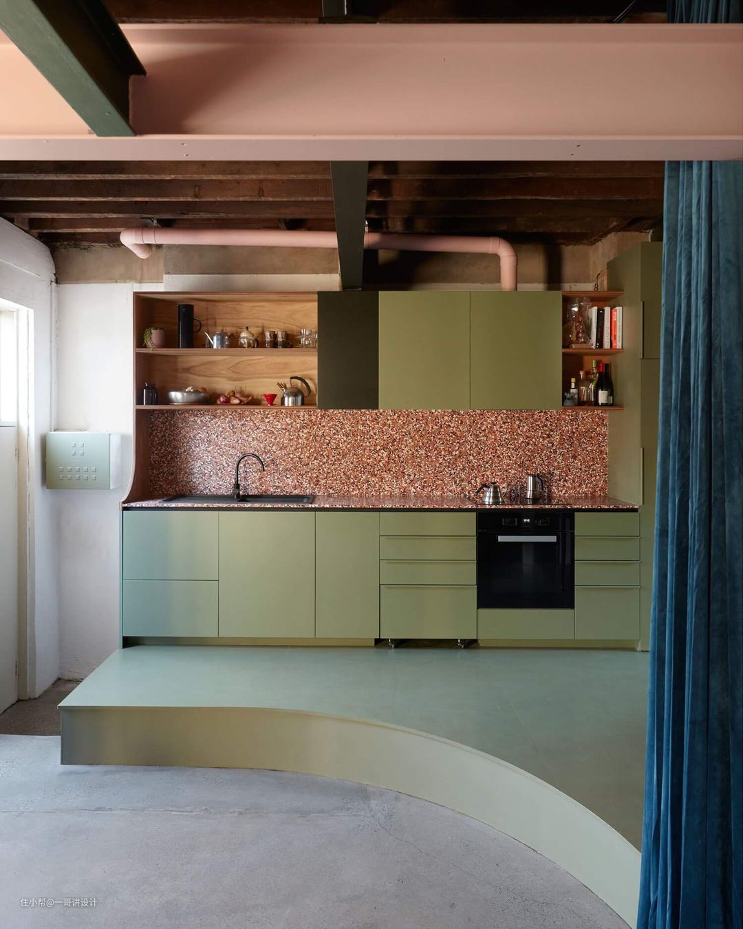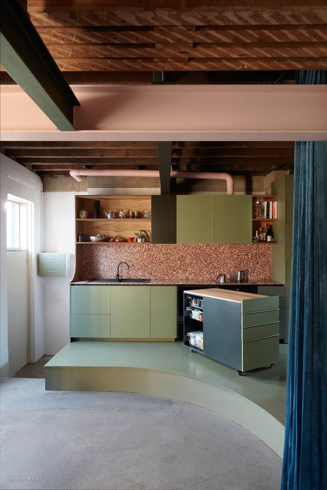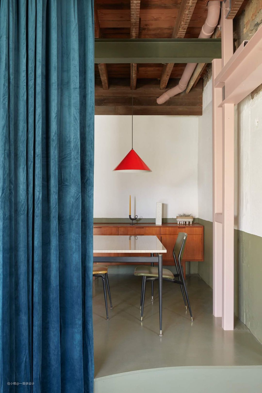 “客户对不同颜色和质地的材质的品味迫使我们打破常规,想出了一些非常不寻常的东西,”设计师们说。海草席子排列在夹层的天花板和地板上,军绿色和粉色增添了清新的色彩,而厚重的丝绒窗帘充当了餐饮和生活区之间的分隔——消除了现有开裂墙壁的粗糙感。