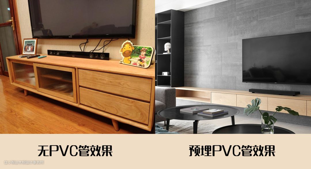 秘密就在电视背景墙里面,在做水电的时候,工人在墙里提前预埋了一根直φ50mm的PVC管。这根管可以作为穿线的通道,像一些电源线、HDMI线、网线、信号线等都能轻松穿入。而且也特别好买,某宝上一搜一大把,价格也便宜。
