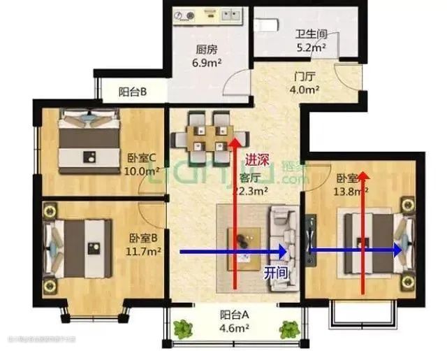 买房讲究户型方正,指的就是户型的开间与进深之比合理,一般开间与进深之比在1:1.5之间较好。进深过大、开间过小,房间会比较暗;而进深偏小、开间过大,则不利于房间保温。