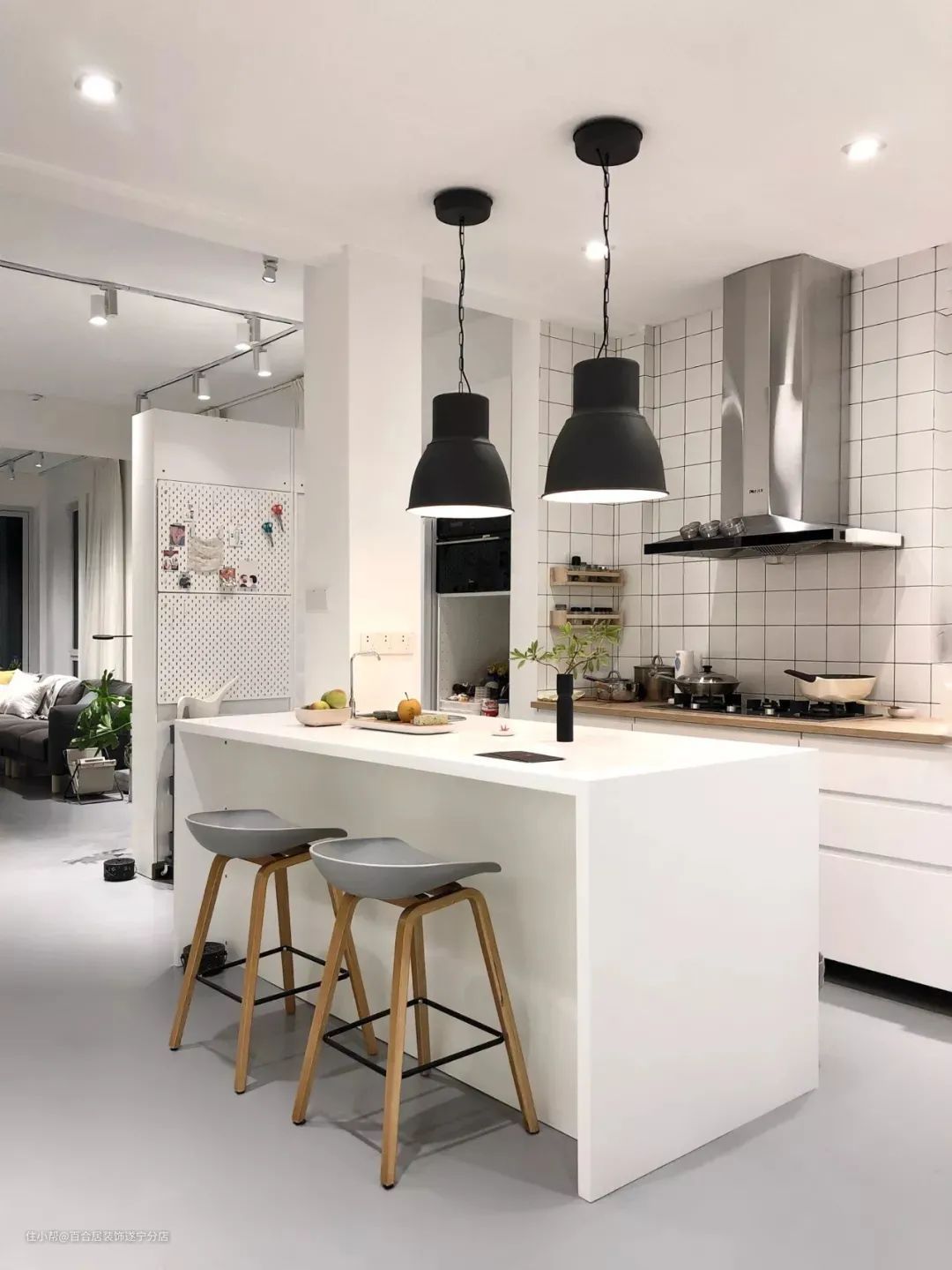 客餐厅甚至厨房打通后,可以很好地改善暗间的采光,并利用岛台或吧台,实现自然分区。