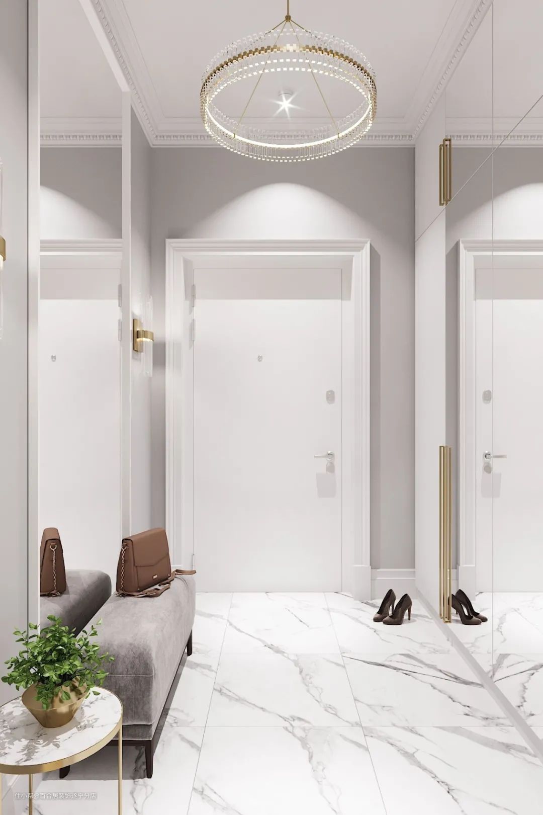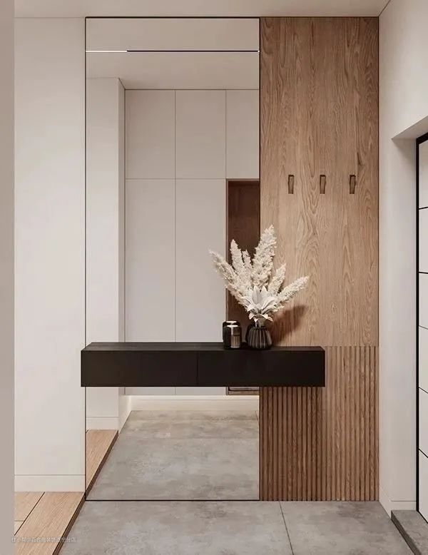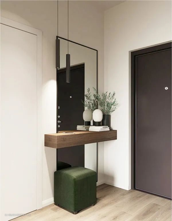 玄关一般是家里采光差、面积逼仄的地方之一,穿衣镜在满足出门前检查仪容仪表需求的同时,还能让玄关显得更宽敞通透。