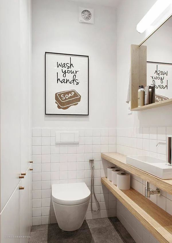 墙面以明亮浅色为主,地面选择原木色、灰白色的地砖,其实浅色地面并不一定显脏,反而颜色越深,灰尘越容易“显形”。