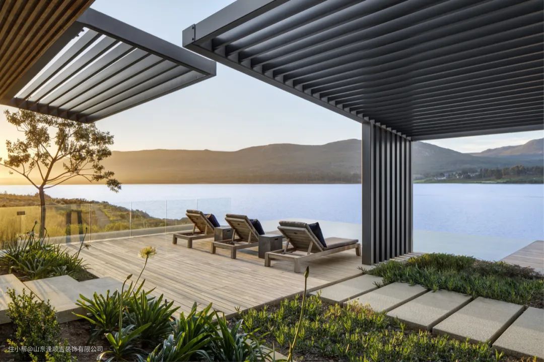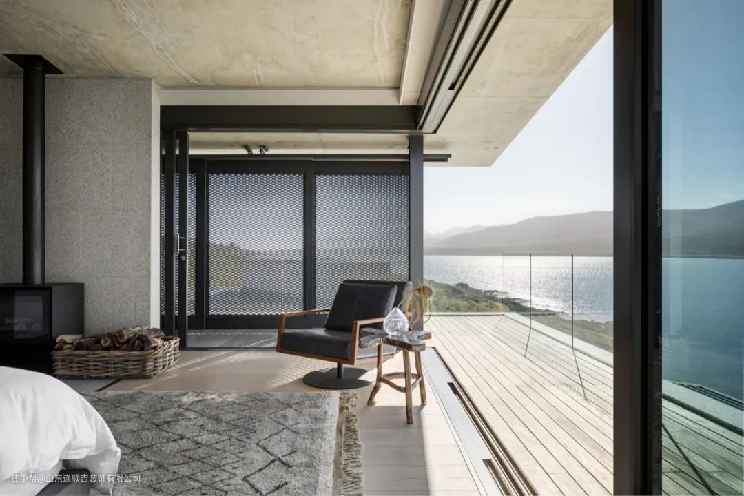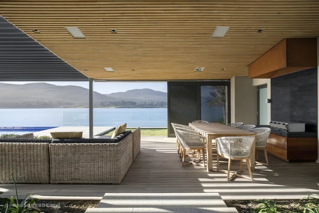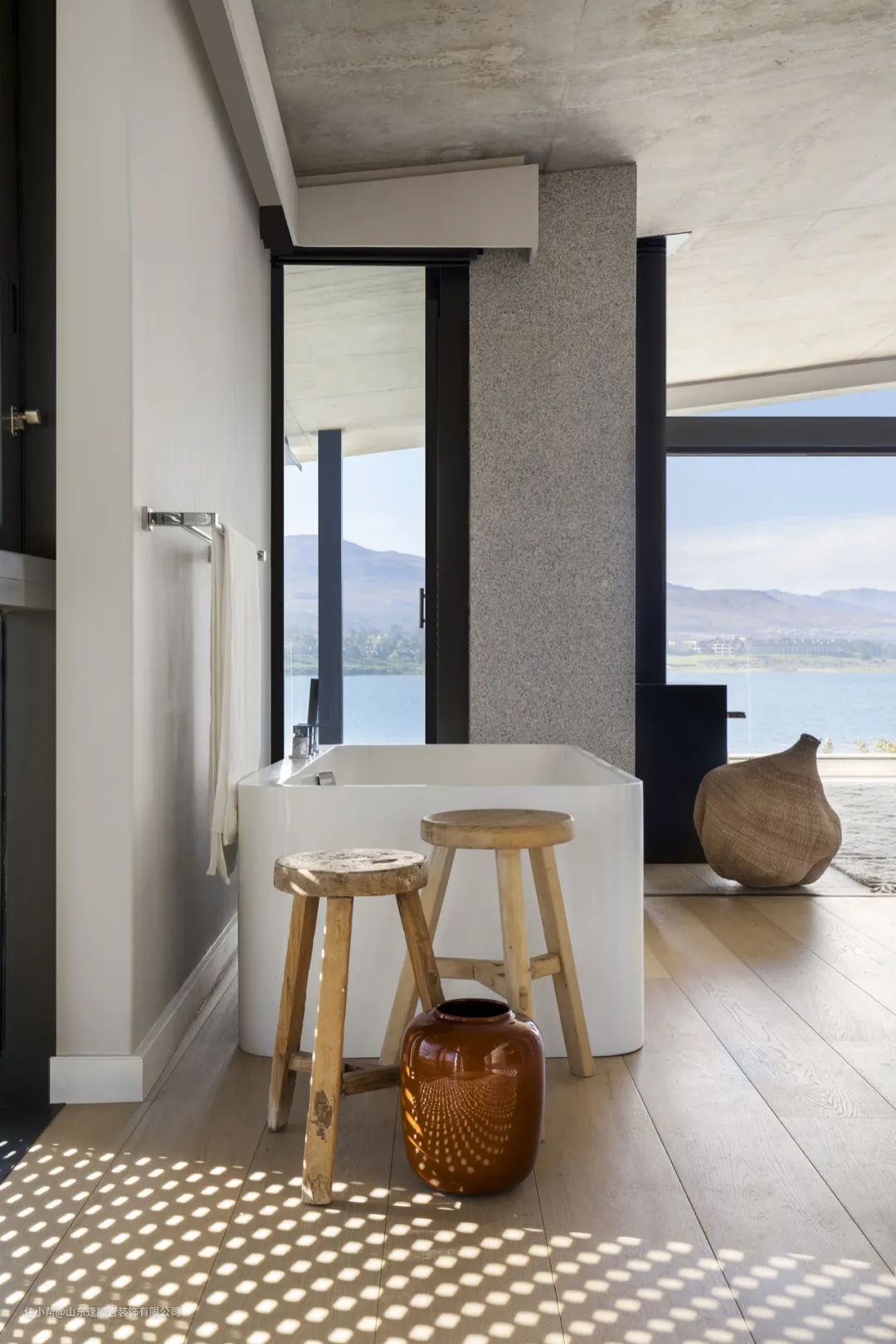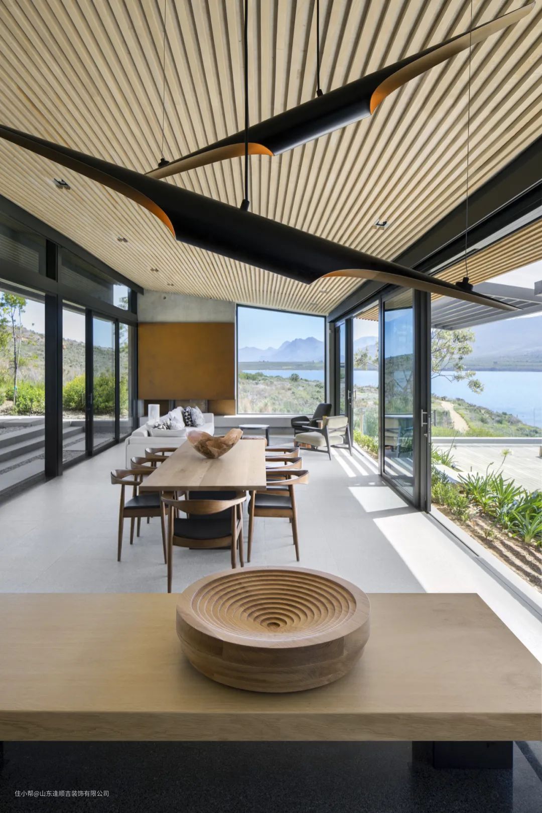 壮阔的美景和背后的山脉为建筑营造一种宁静惬意的居住环境,简单的几何体块分割,开阔而洒脱,开放的空间结构将自然景观引入建筑内部。