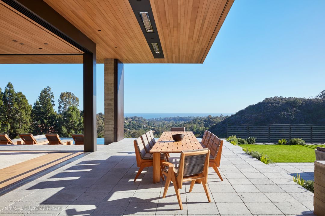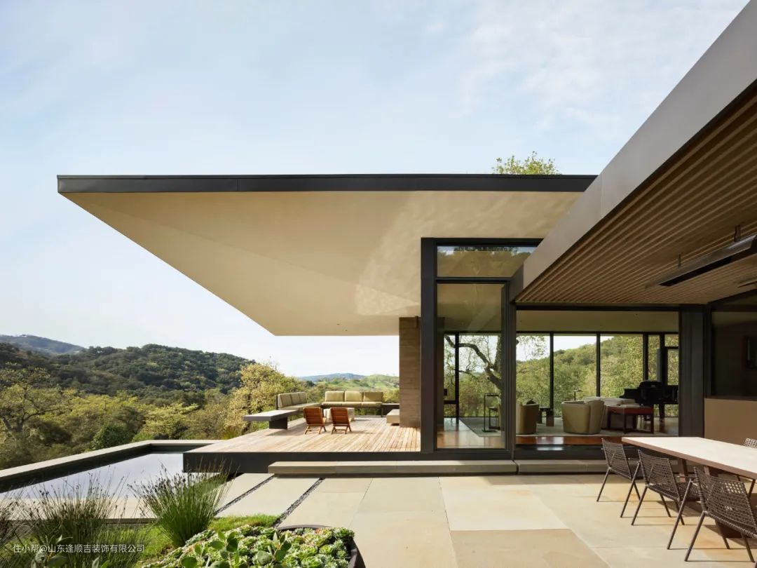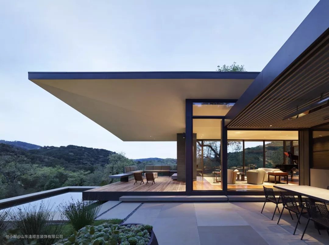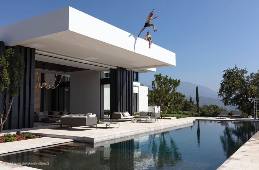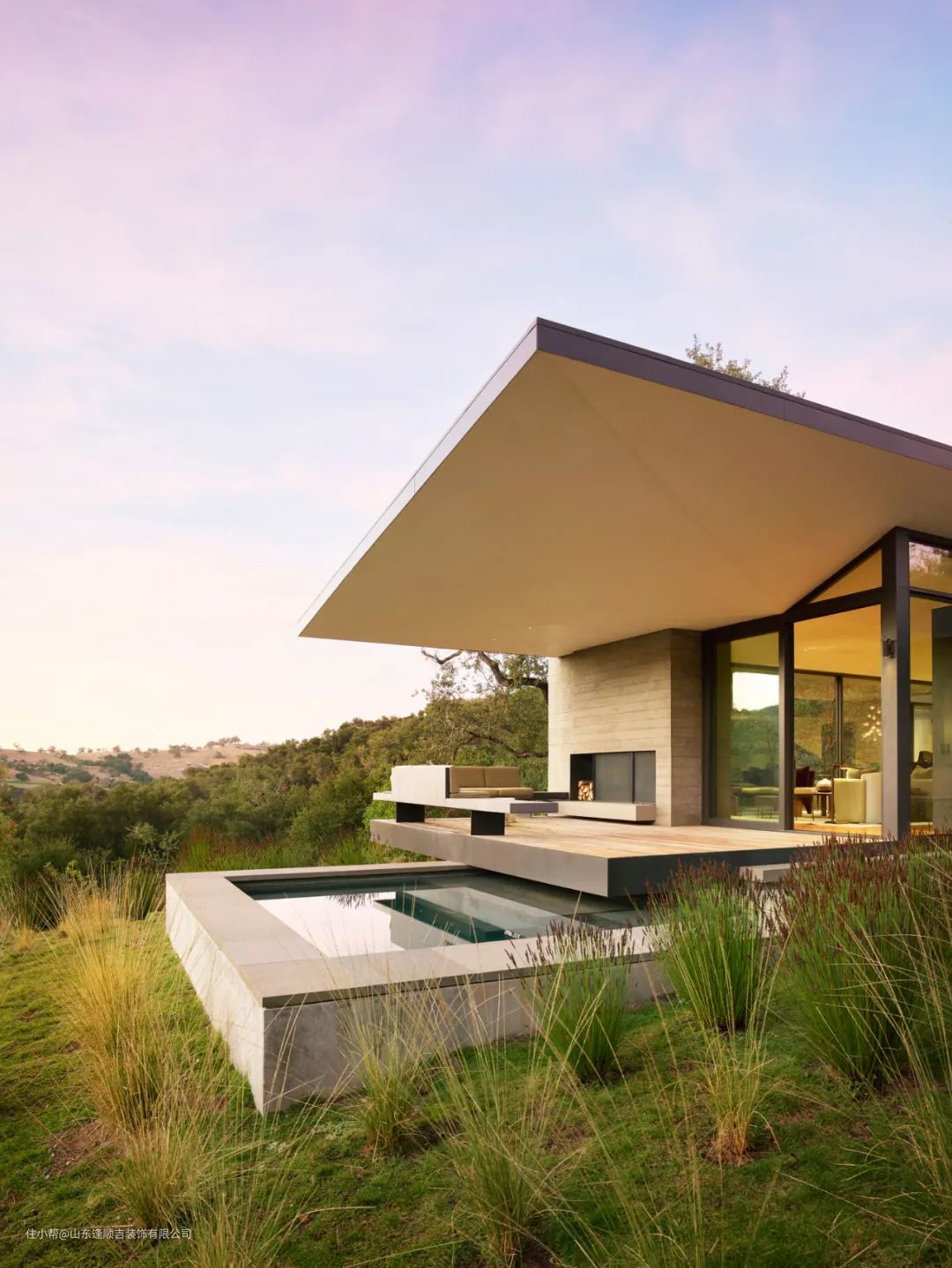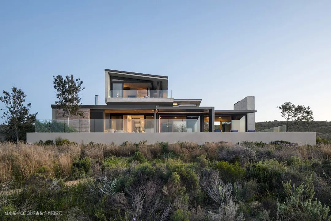 壮阔的美景和背后的山脉为建筑营造一种宁静惬意的居住环境,简单的几何体块分割,开阔而洒脱,开放的空间结构将自然景观引入建筑内部。