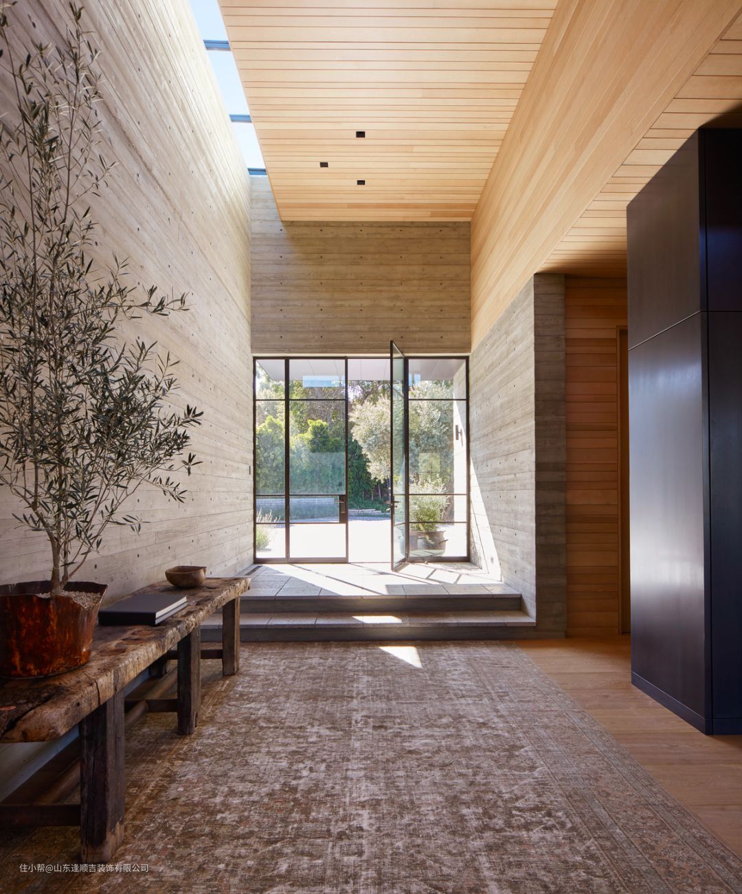 入户空间原始质朴的混凝土搭配木质元素,简约而有质感,顶部的天窗带来良好的采光效果。