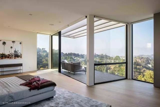 主卧空间的露台与阳台连接,全开放的空间设计随时拥抱大自然,简约低调的室内设计,没有多余装饰,彰显恰到好处的精致格调。
