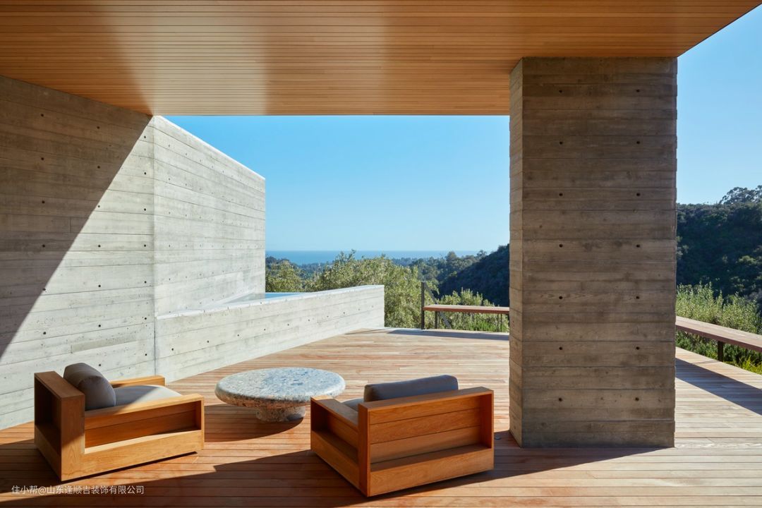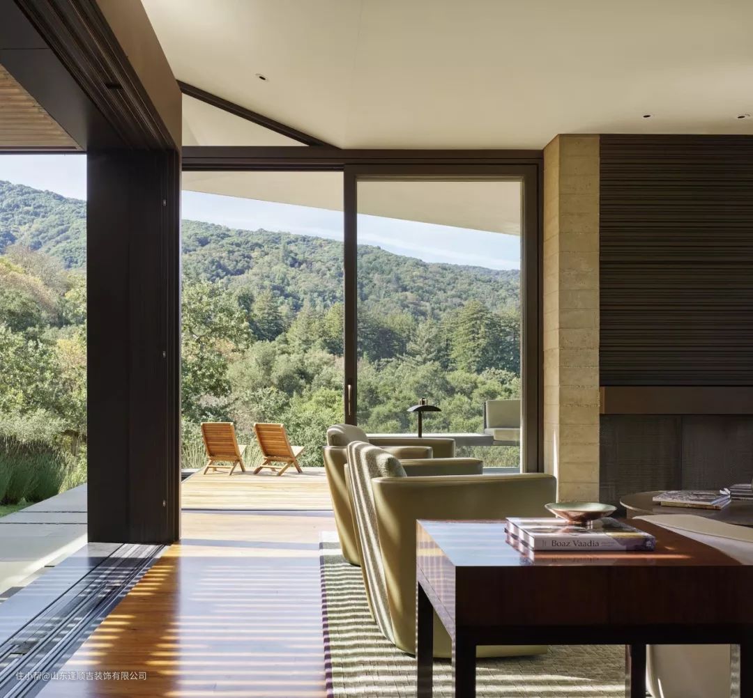 二层的起居室以大尺度的空间为框,把远山作为视野背景,形成无限框景,开放性体量的穿透,让视觉得以无限延伸,如同一幅艺术画,让人流连忘返。