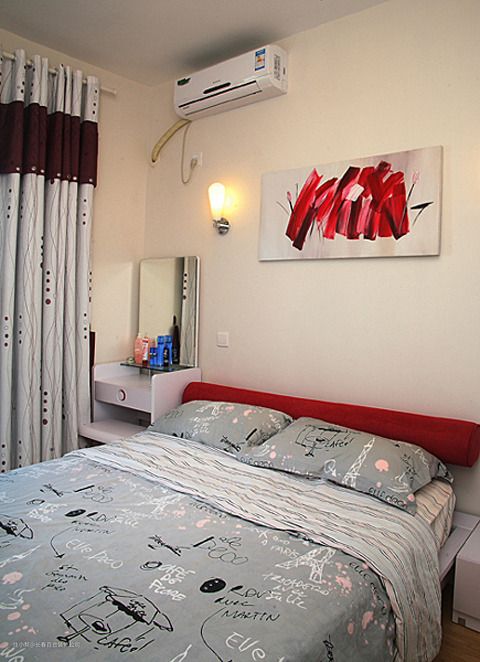 主卧室仍以白色为主色调,以简约的设计来打造舒适的睡眠环境。红色纯粹作为少许的点缀融入空间,让空间色彩更加丰富而又不会喧宾夺主。印有卡通图案的床品非常适合年轻夫妻,也是时尚元素的体现。