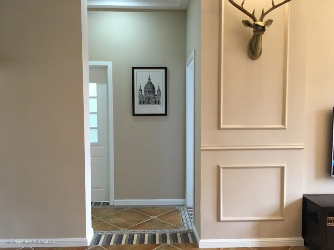 房门如果两边地面没有高度差,而且材质也是一样的话,也可以考虑运用彩色砖来做过渡,让空间显得更加活力跳跃,比如美式风格、田园风格中,就经常看到马赛克、彩色砖等比较显眼的门槛石设计。