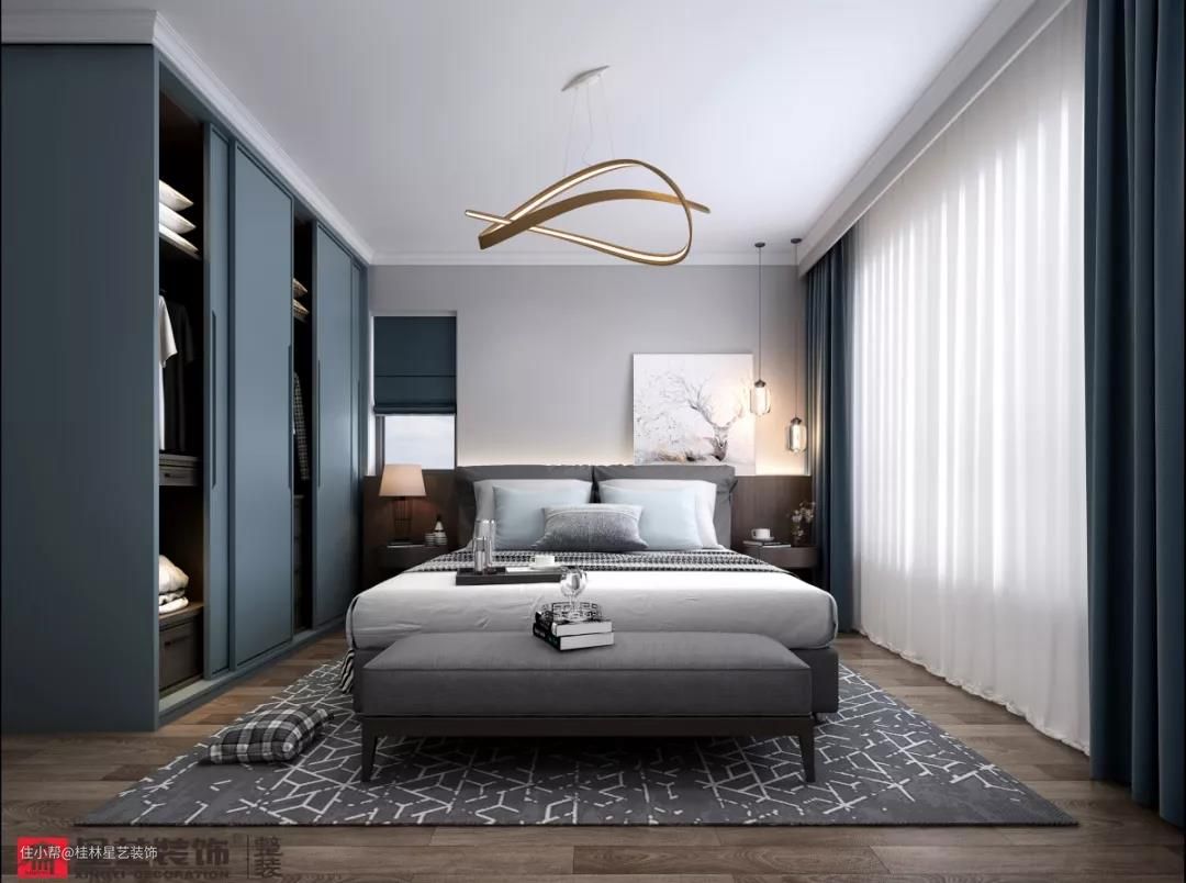 卧室整体风格色调与客厅亦相辅相成,整体配色是雾霾蓝+高级灰。