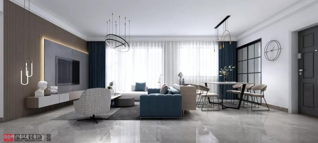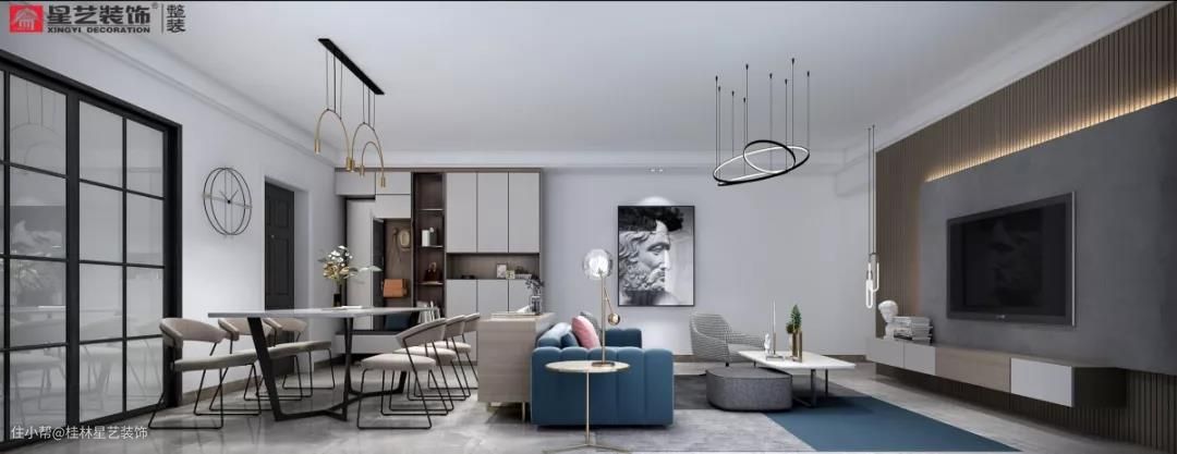 本案以灰、白色为主色调,中性冷色调,为整个空间铺垫一层低调优雅基调,雾霾蓝的点缀弱化整体灰白色带来的冰冷感,为整个家居氛围带来一种温馨感。