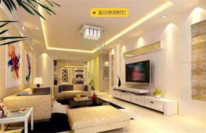射灯本来是用来重点照明的,有强调展示品的作用,但有的人却用在一般照明上,天花板上的射灯使得天花板过分抢眼,对其他物体照明效果反而相对减弱。