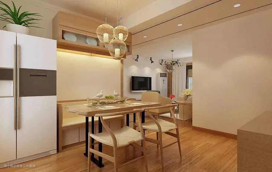 餐桌正上方的灯是灯光的主体,多选择下罩式的、多头型的灯具,光源距离桌面65cm即可。