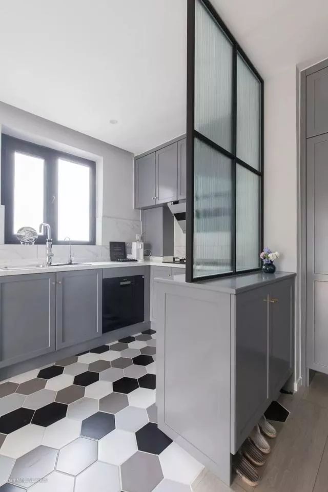 玄关的定制鞋柜+玻璃屏风隔断,让进门后的开放式厨房保持一定的私密性。