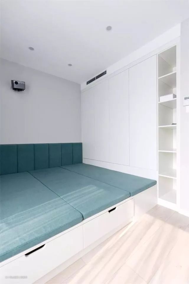 客厅没有电视,在卧室的床头墙面留出投影幕布,坐在床铺上看看电影,也是非常舒适的。