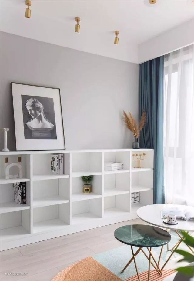 以书架布置的电视墙,让客厅空间以阅读与休闲为主。