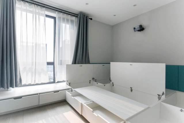卧室定制的榻榻米与窗台连成一体,让床铺空间显得更加宽敞舒适,床底区域也是丰富实用的收纳,居家的物品再多也有方便的存放位置。