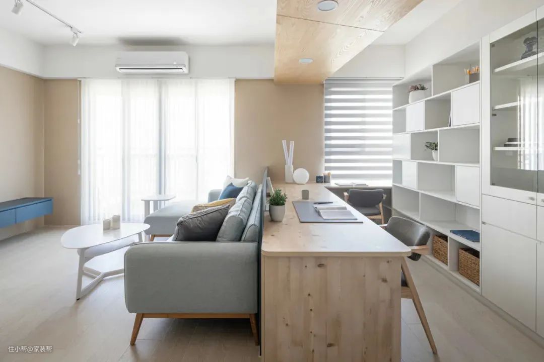 适合大横厅设计,或者设计开放式书房,将两个空间之间的墙体打掉,改为吧台式书桌,书房光线会更好。