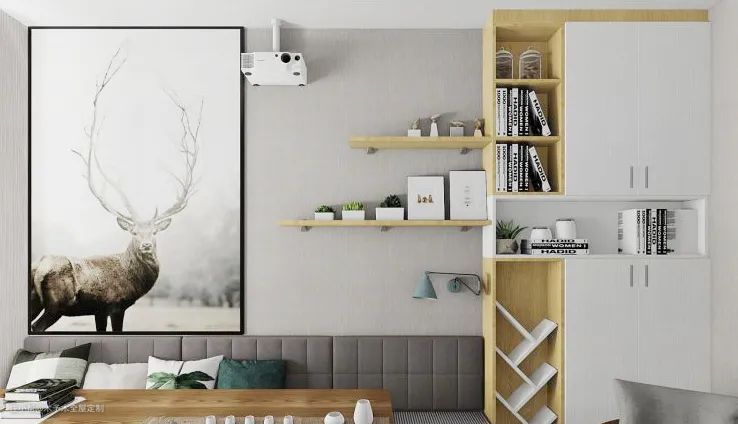 ▲定制整墙收纳柜,柜体设计遵循“藏八露二”的原则,下方留出空位靠墙放置沙发,开放格主要放置书籍或装饰品,杂物则收纳在封闭柜里,保证背景墙的简洁美观。