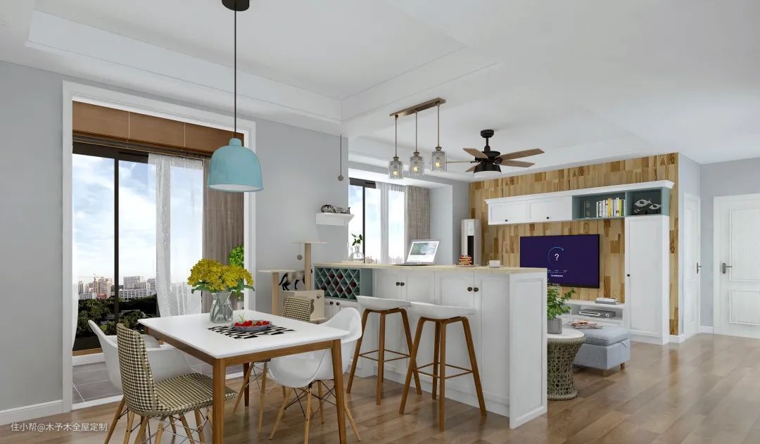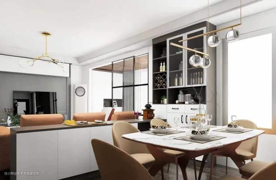 ▲沙发背后设计吧台隔断,可以起到划分空间的作用,还能作为工作区使用,平时也能在这里小酌一杯、增添生活情调。