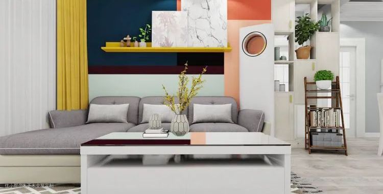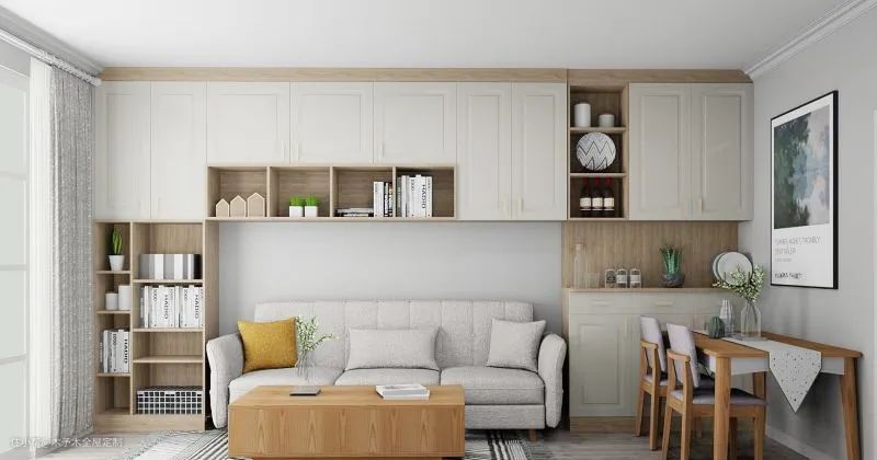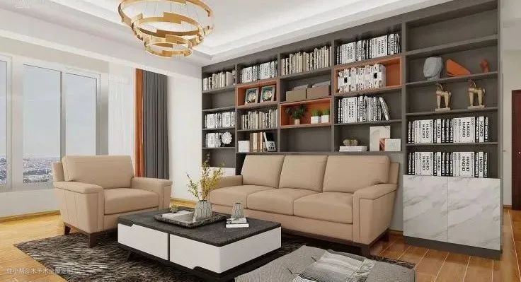 当沙发不靠墙的时候,沙发墙可以是空气,也可以是一个矮柜,或是一个不同形式的隔断,可以根据你的喜好进行设计。