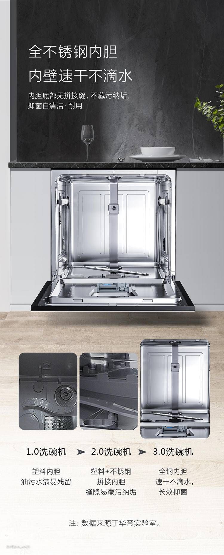 华帝iE2采用了一体不锈钢内胆,在同价位中这样用料的产品还并不多见,相对而言更加良心,产品的耐用度也有长足的提升。目前这个价位里,不少厂商依旧采用塑料和不锈钢拼接的内胆,甚至有的产品还在使用纯塑料的内胆。虽然成本更低,利润更高,但是随着消费者对于洗碗机产品本身了解越来越深入,这些产品终将会被淘汰。