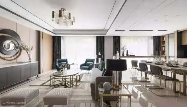 客餐厅采用高低错开的吊顶,美化横梁的同时又起到了分割空间的作用,整个空间也会显得更有层次感。