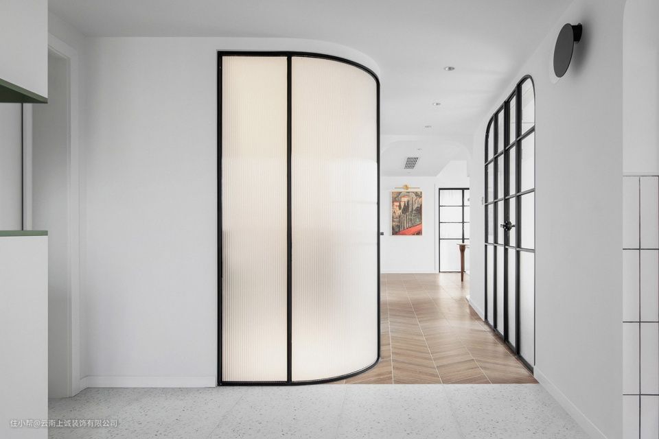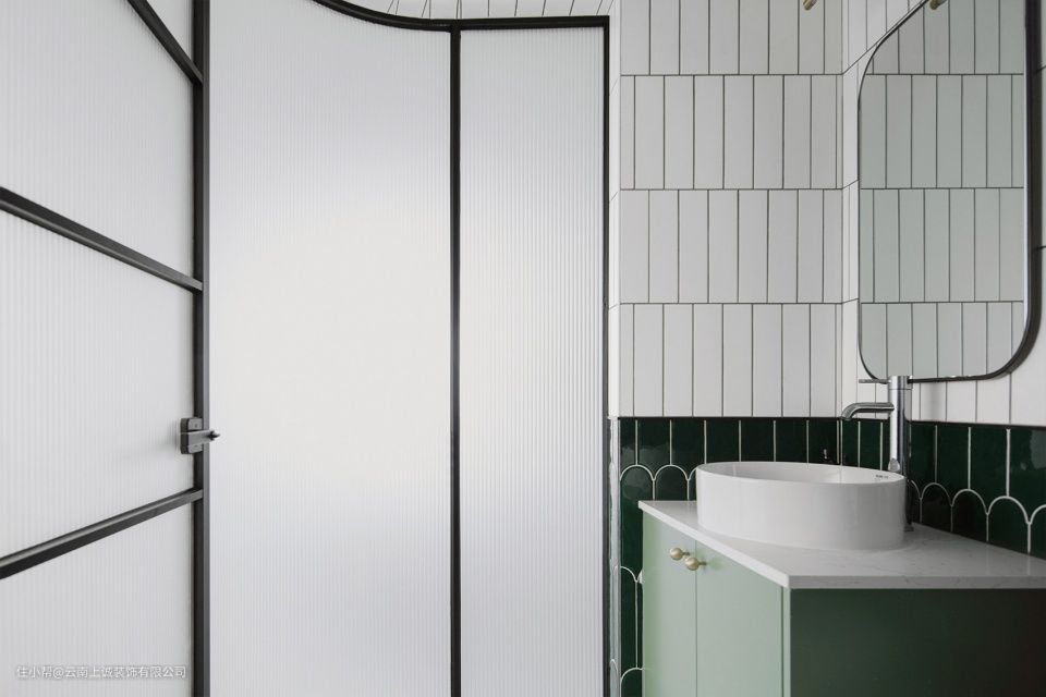 拆除原本卫生间西侧和北侧的实墙,用弧形玻璃隔断替代。玻璃隔断为卫生间提供了自然采光。玻璃上的曲面竖纹肌理保护了隐私且增加了空间的柔软度。