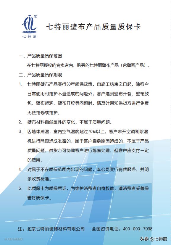 七特丽无缝壁布2008年开始研发,2009年2月申请国家专利并获得授权。七特丽无缝壁布表面釆用棉、麻、丝、涤做为主材,背面釆用发泡涂层植绒技术,具有超高宽无接缝,特环保,特抗拉,特耐磨,消音吸音,透气防潮,好贴耐用等七大美丽的特点!一面墙壁一块布,当天施工当天住!不论宾馆饭店、公寓别墅,新房改造,旧房翻新等都可以使用!贴饰效果高大上,使用维护很方便,环保方面更放心。
