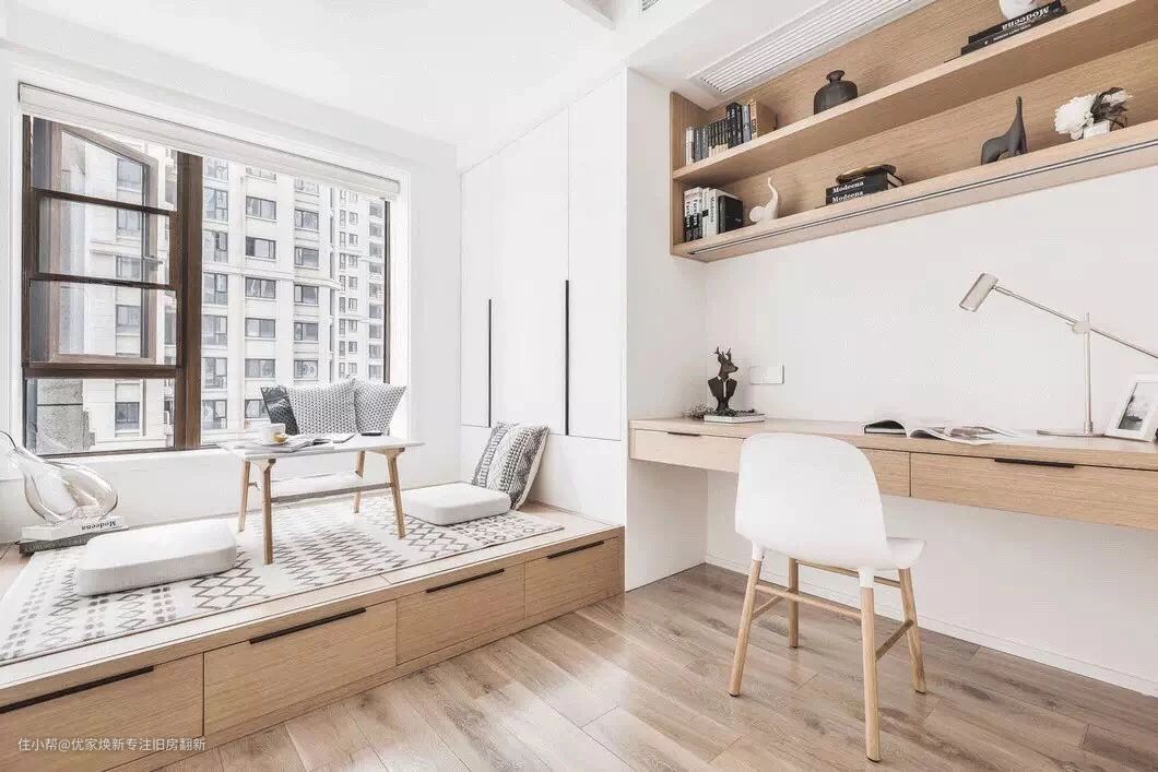 在装修设计的时候,我们可以利用榻榻米将房间的飘窗进行延伸,同时搭配上定制的工作台,闲暇之余还可以躺在榻榻米上看书,同时也可以兼做客房的功能,非常方便。