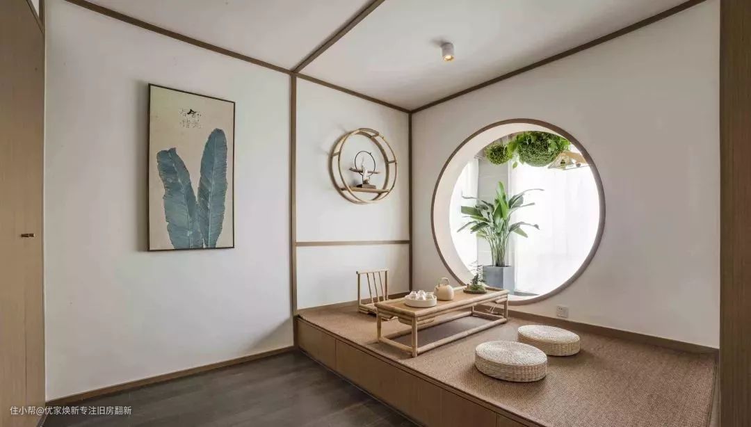 而在榻榻米之上,有中式和日式的两种风格的茶室家具供你选择。中式则是木或竹,日式则是蒲团或者软垫,非常惬意。