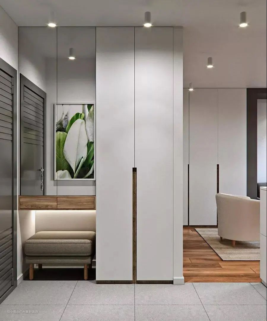 在鞋柜旁边,可以增加一个换鞋凳和镜子,方便换鞋也方便出门出门整理着装。