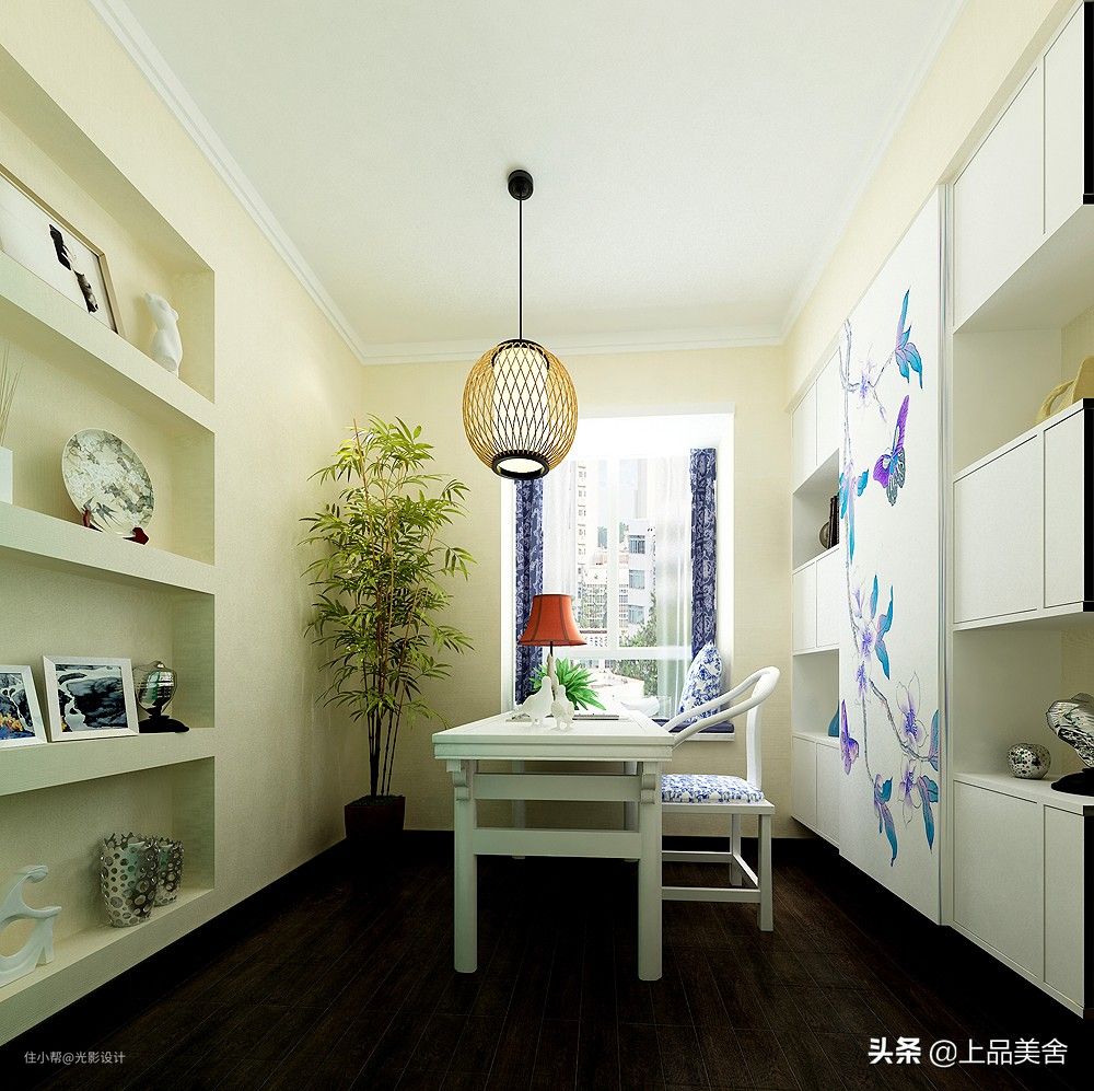 房间以花卉装饰画为中心,两侧做对称式的封闭与半封闭相结合书柜,有着超强的收纳功能;靠窗打造飘窗,增强空间采光的同时还可以坐在上面 看书学习;顶部安装复古式的灯饰和墙角的绿竹相组合,打造出质感十足的室内氛围,一个古香古色的新中式书房就出来了。