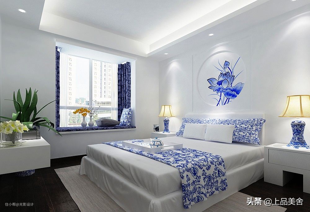 卧室摒弃了繁琐,打造简约舒适的休息空间;空间延续整体风格,采用白色系为主色调,选用蓝色系荷花床头背景点缀房间,让整体空间安静舒适 ,静谧而清新;木质的地板和床头两侧艺术感十足的灯饰相组合,搭配出舒适又时尚的视觉效果;飘窗带来了宽阔视野的同时也增加了房间的采光 效果,真是美观又实用。