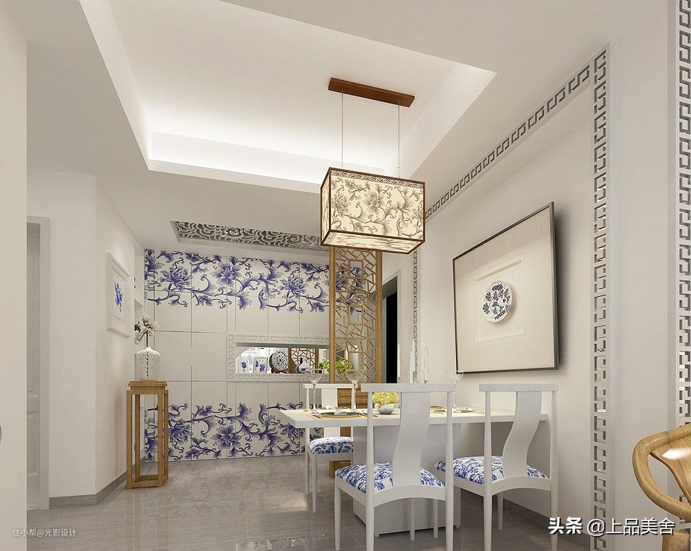 餐厅和玄关相连,用镂空的隔断来分隔空间,餐厅采用木质餐桌椅,经典的蓝白配色,呼应玄关空间,雅致又有格调;顶部中式木色的灯饰,夸张 但不浮夸,独特的造型让人眼前一亮;空间整体的木色和白色组合,洋溢着温馨幸福的味道。