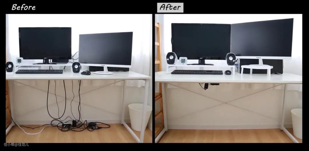 Step5.同样方法,电脑区所有电线集中收纳在显示器背面,用Seria杂物架放路由器,粘2个挂钩来固定网格架