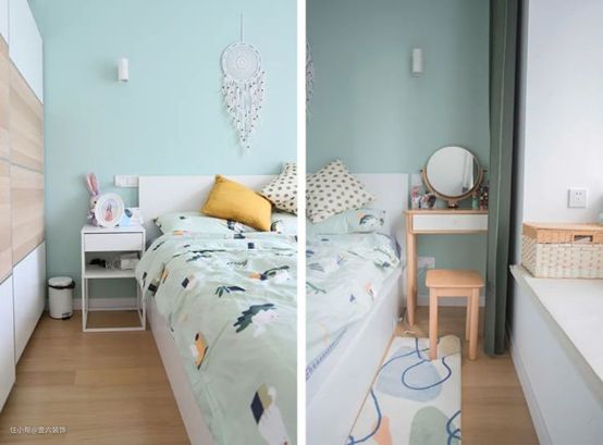 主卧在格局上没有做太大的改动,床头墙刷了偏薄荷绿的颜色,搭配了同色的床品,飘窗的光线充足,窗帘用深绿色降低室内颜色,制造丰富层次感。