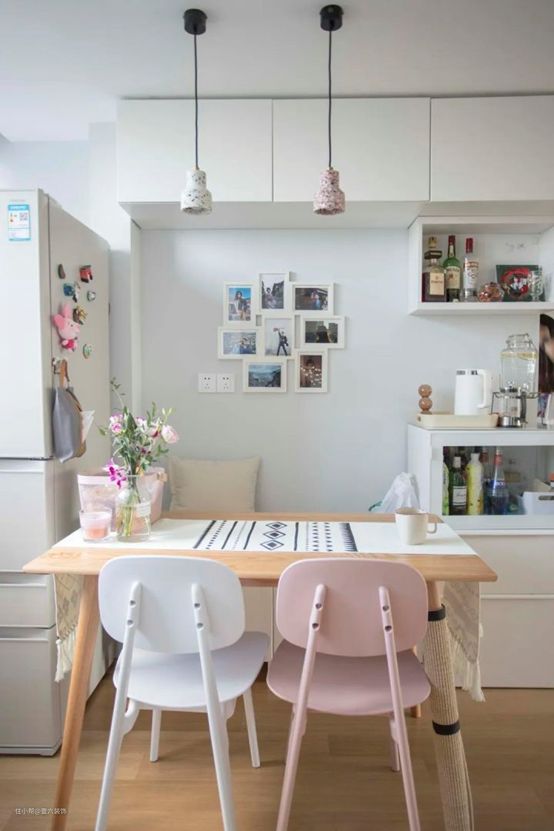 空间有限,所以靠近墙面设计了卡座,周围的柜子和餐边柜都是按照宜家的模块化储物柜组合的,墙面的宽度是1.8m,一个柜体的宽度是60cm,正好搭配3组。